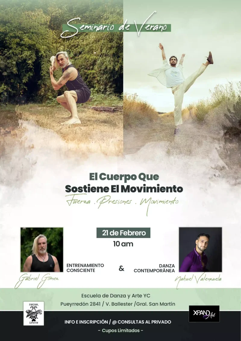 - Bloque 3 (a cargo de Nahuel Valenzuela): Unión de los dos universos: integración del sostén y la dirección en secuencias fluidas, uso consciente del peso, transiciones y movimiento continuo.